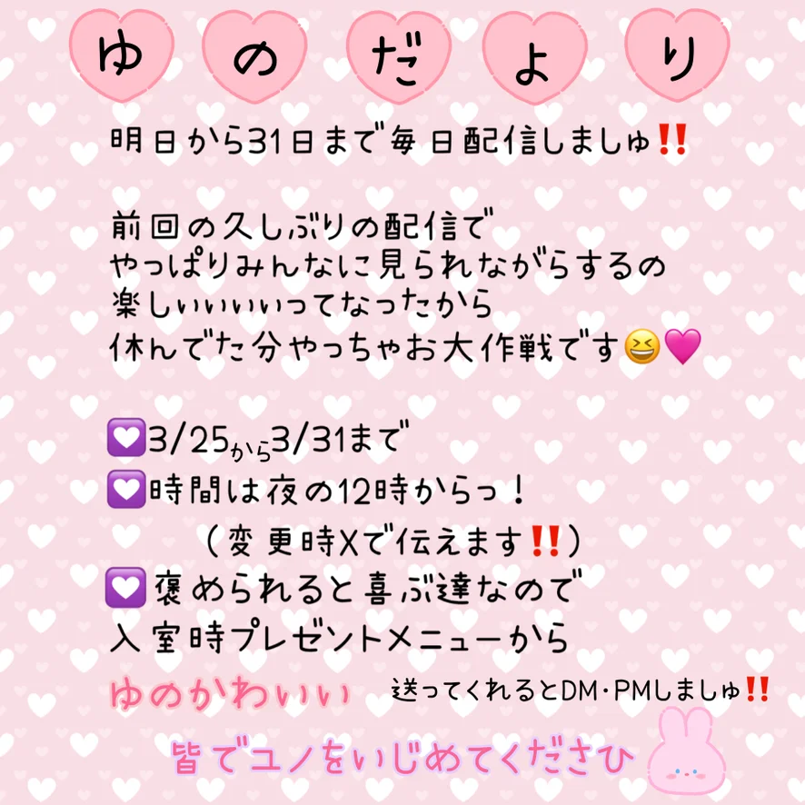 コメント欄での喧嘩や強い口調は控えてください。みなさんと平和に楽しく過ごしたいです☺️ 画像や動画を無断転載しないでください。 ゆのは日本の法律に従い配信します!性器の露出はできないので強要しないでください。 リクエストはメニューからお願いします。コインのないリクエストには対応できません。 トラブル防止のため、他の女の子の話は私からしない限り話題にしないようにお願いします。 他のキャストさんのお部屋でゆのの名前を出さないでください。 チケチャ開始10分までにサーバー不良で落ちた場合は、全員の方に返金対応させていただきます。 10分以降はチケチャ成立とさせていただき、返金ができませんのでご了承ください。